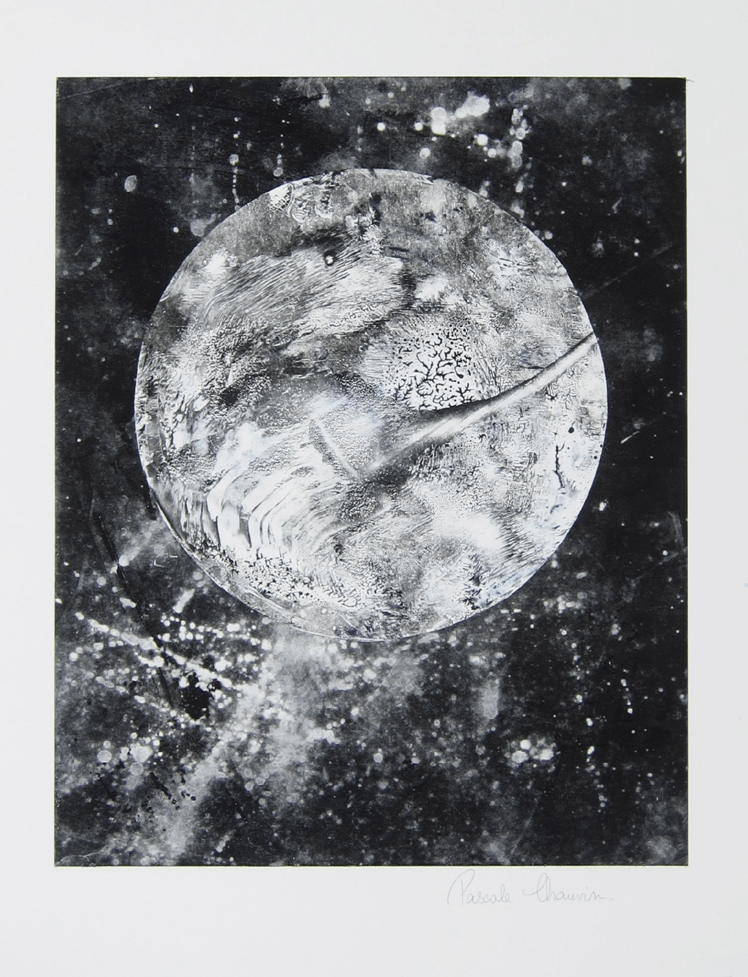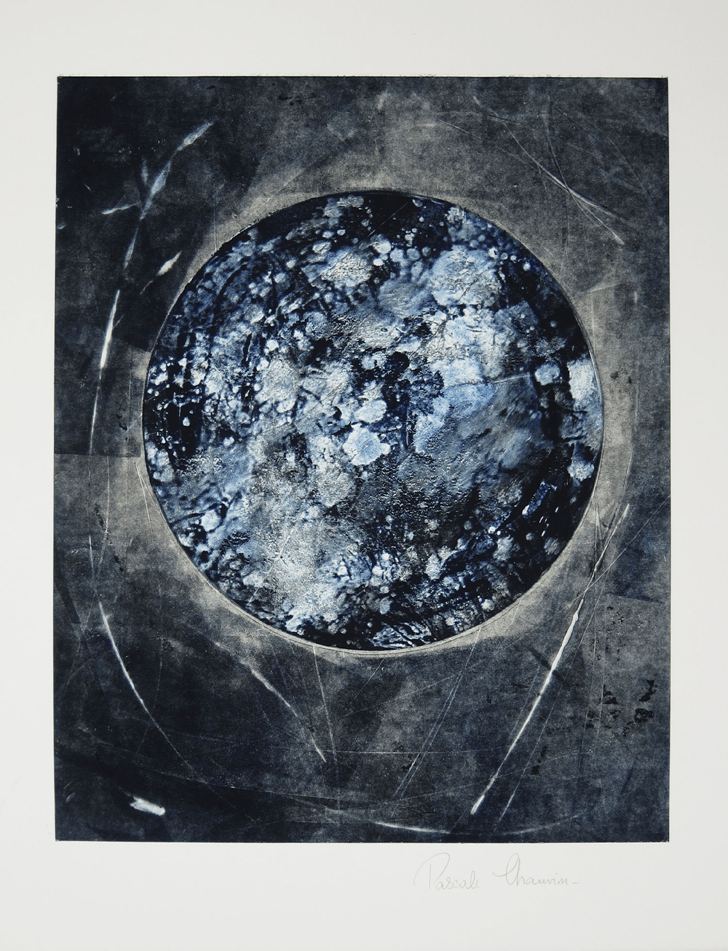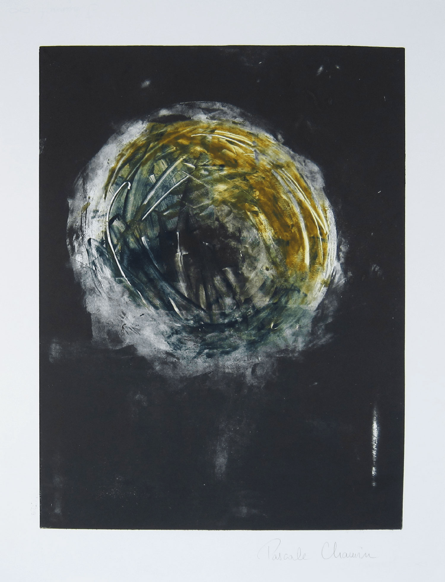 "Pascale Chauvin created a series of skies that built up a poetic cosmos apart from scientific and technological pictures. Fascinated by the night, she loves looking up at the sky, a physical and spiritual space as well. She tries to reach a natural, sometimes even violent, living beauty, preferring the irregular landforms of the planets to more even surfaces.The technique of monotype which consists in drawing with etching inks enables her to produce a single picture and obtain peculiar effects through the printing process. Each print is enriched by the previous one. Finally, the monotype demands a technical ability which doesn't abolish chance. Much to the artist's delight."