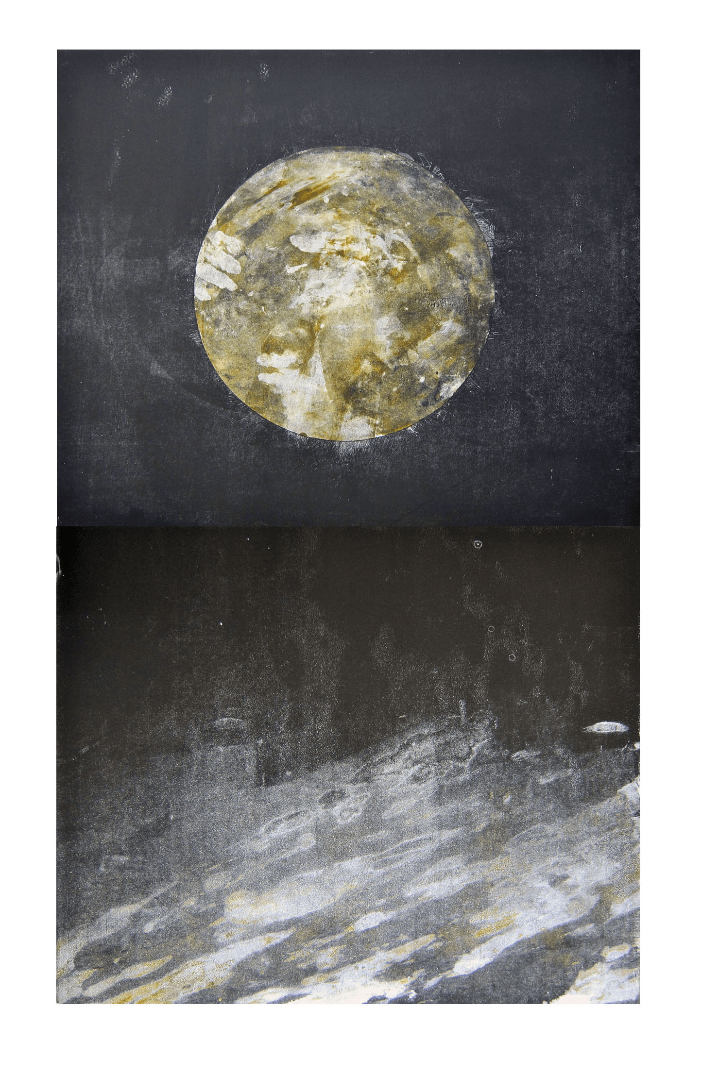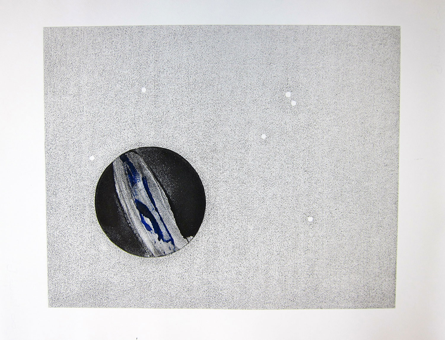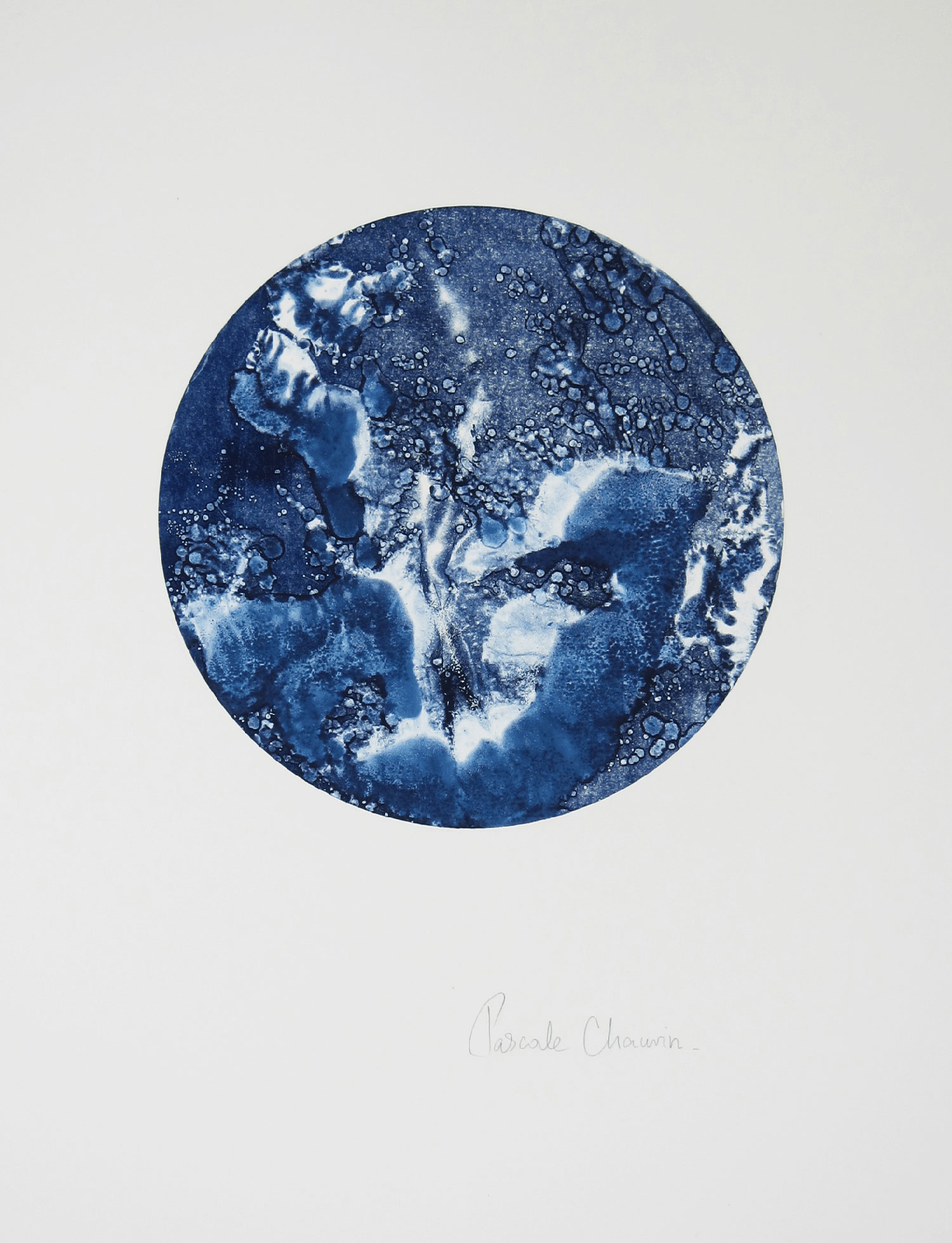 "Pascale Chauvin created a series of skies that built up a poetic cosmos apart from scientific and technological pictures. Fascinated by the night, she loves looking up at the sky, a physical and spiritual space as well. She tries to reach a natural, sometimes even violent, living beauty, preferring the irregular landforms of the planets to more even surfaces.The technique of monotype which consists in drawing with etching inks enables her to produce a single picture and obtain peculiar effects through the printing process. Each print is enriched by the previous one. Finally, the monotype demands a technical ability which doesn't abolish chance. Much to the artist's delight."