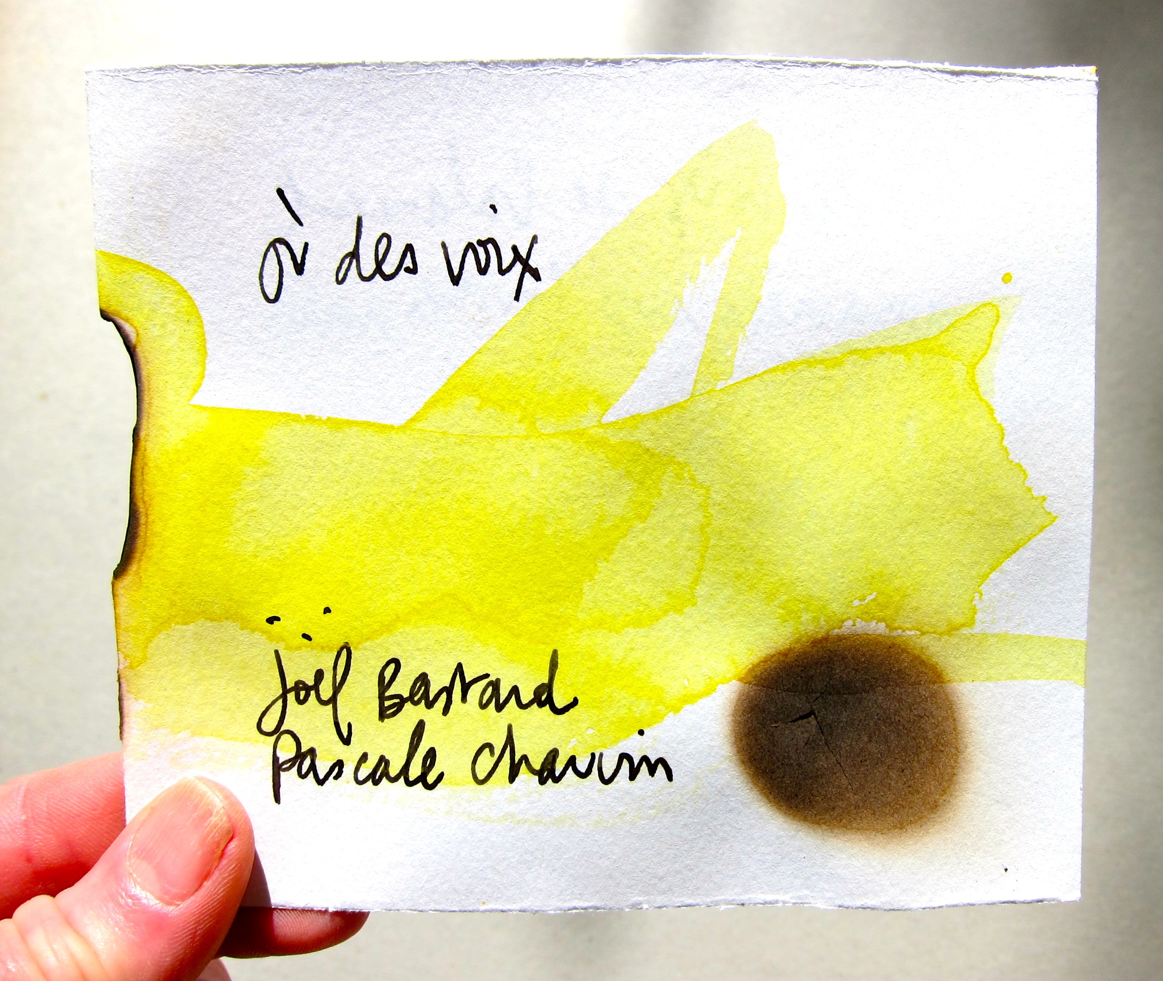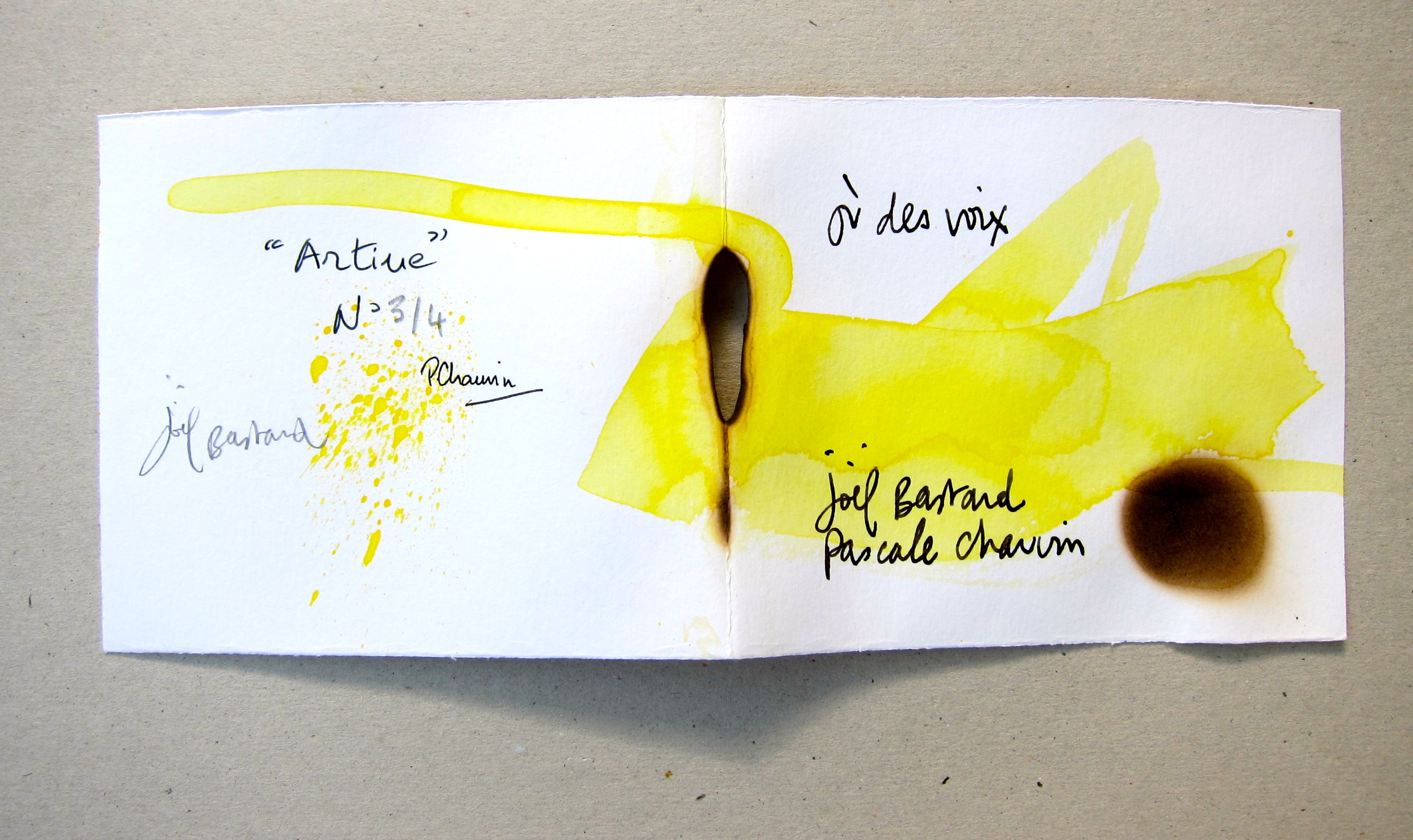 Limited edition of 4 signed and numbered copies. Acrylic ink and burns on paper, with a text by Joël Bastard. Published by Éditions Le Livre pauvre. 4 pages, 12,5 × 10,5 cm, 2015.