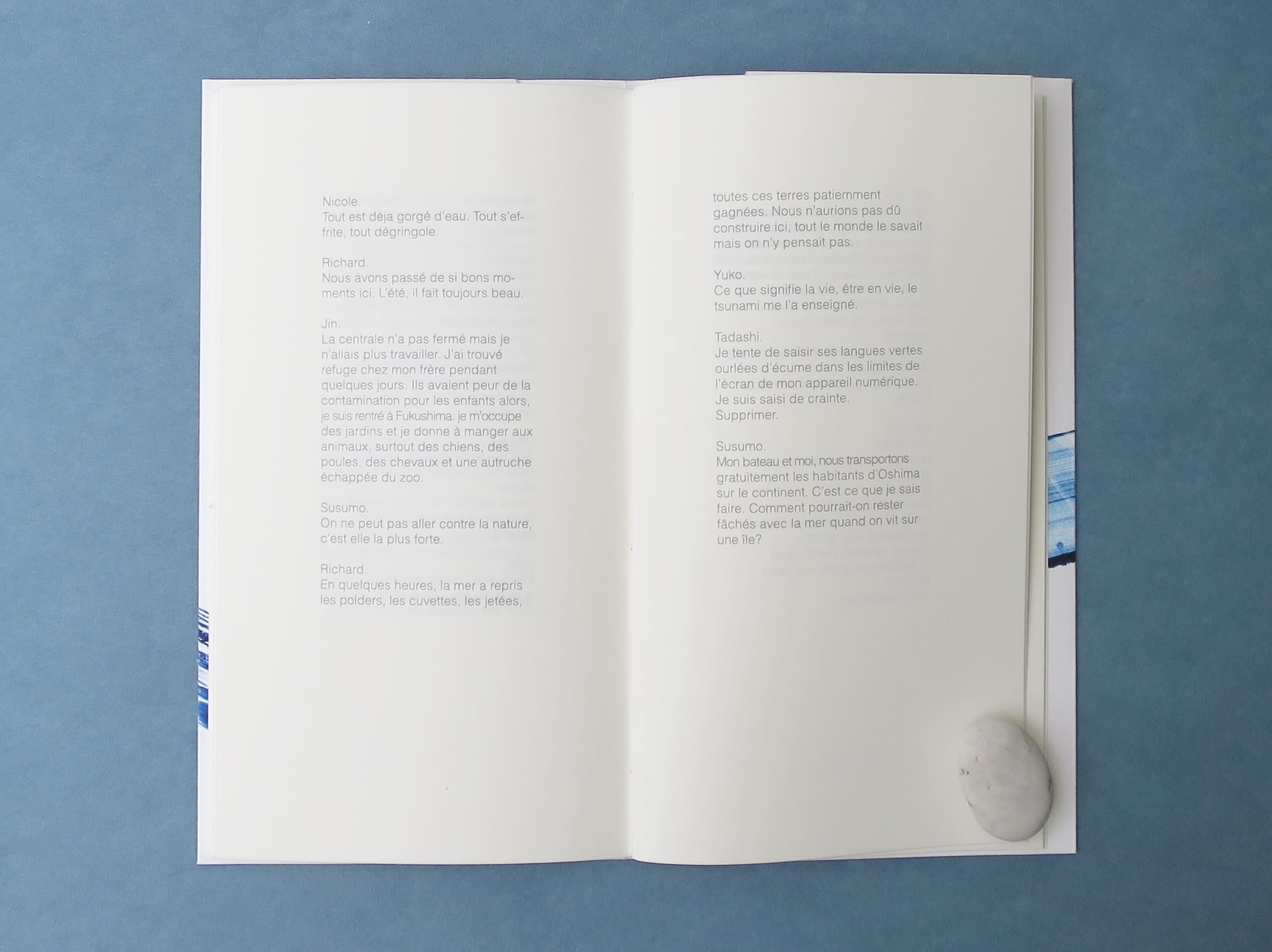 How can people continue living after natural disasters ? This is the question Aurore and Clément are asking themselves. The two young artists are haunted by the devastation by a gigantic wave of two territories they love, both in the north-east of Japan and in Vendée. Both of them create words and pictures to try and revive the flooded landscapes and lost lives. Sous la vague is a poetic evocation based on real facts, mixing fiction, dialogues and calligrams : the victims and witnesses of Xynthia and the 2011 tsunami in Japan speak to each other and reverberate from one side of the world to the other.