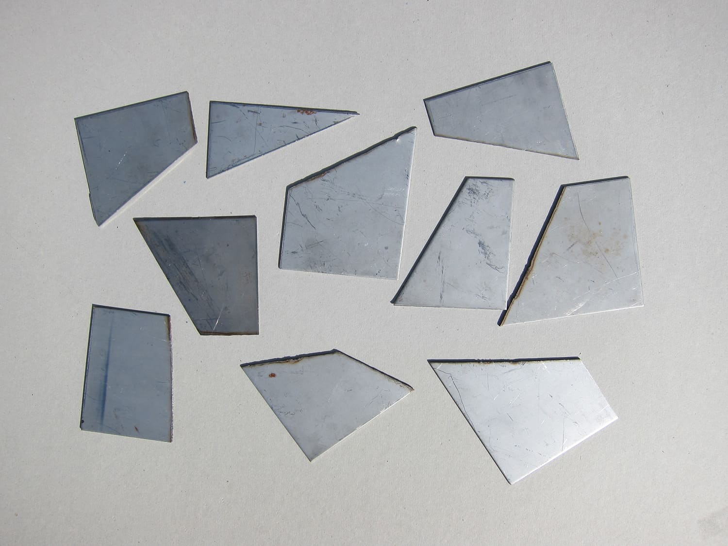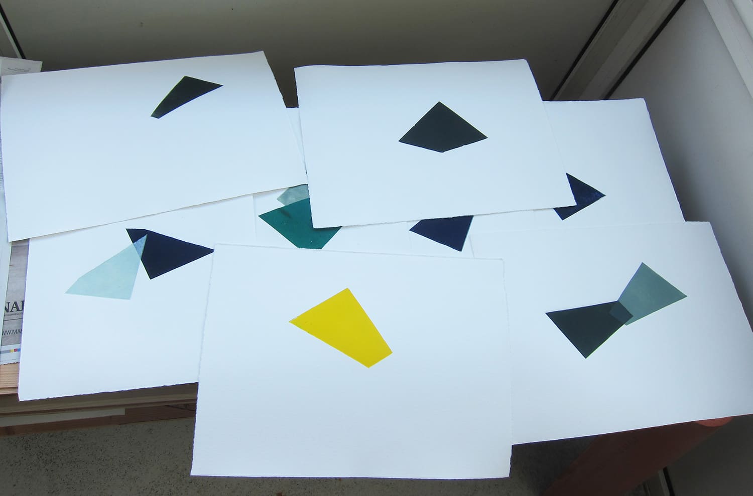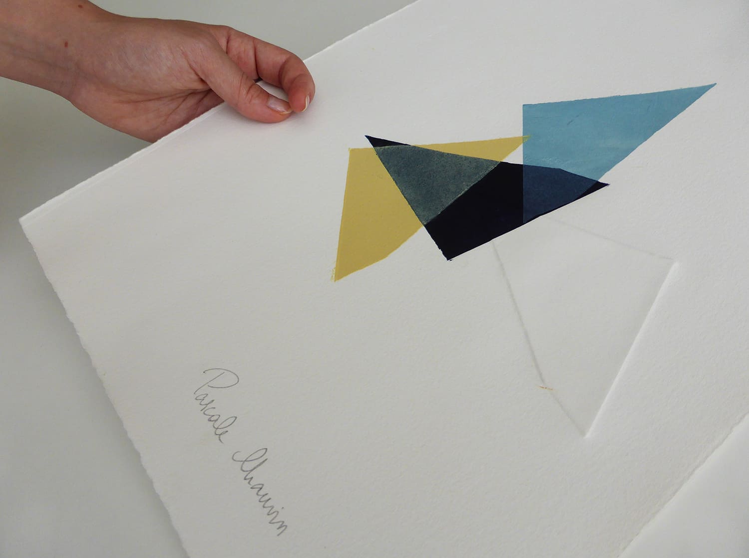 Embossing with sheets of metal offcuts found on the coast of Vendée. Oyster farmers use them to show the different sizes of oysters in oyster beds. The artist printed each sheet of paper successively from two to four times with the same offcut, in the colors of the sky, the sea or the plants of that area. The last print is a similar but reversed shape obtained by embossing.